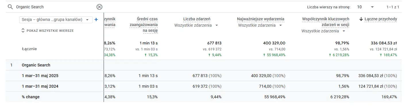 Wyniki potwierdziły, że obraliśmy właściwy kierunek. Przychody z ruchu organicznego wzrosły rok do roku o ponad 170%. Współczynnik kluczowych zdarzeń na sesję poprawił się z 1,56% do aż 98,79%.