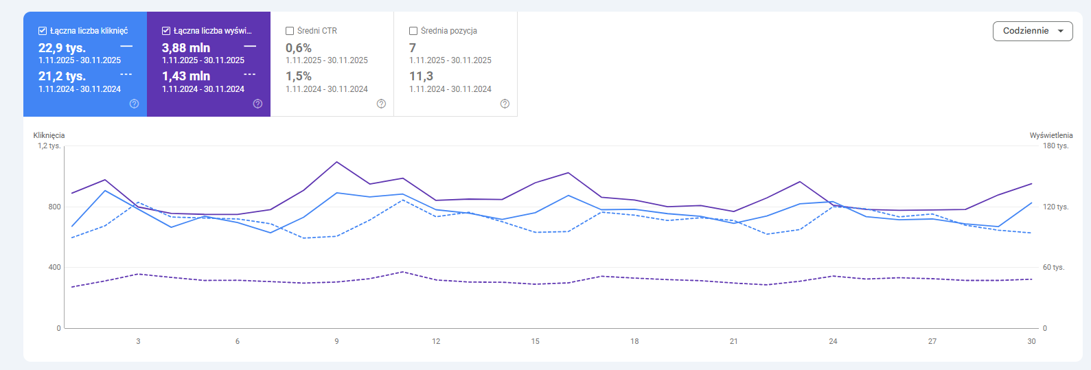 Liczba wyświetleń zwiększyła się o niemal 200%, a średnia pozycja strony w SERP osiągnęła 7 miejsce, co jest dobrze widoczne na poniższym zestawieniu z Google Search Console. Przy tak drastycznym skoku widoczności siłą rzeczy CTR się obniżył, bo poszerzyliśmy widoczność także na frazy, które mają mniejszy potencjał konwersyjny.